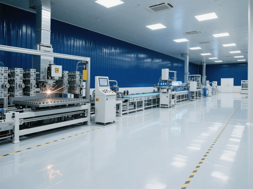 智能控制系統(tǒng)集成環(huán)境監(jiān)測、設(shè)備聯(lián)動和MES數(shù)據(jù)看板,深藍墻面上嵌裝LED智能顯示屏,實時反饋生產(chǎn)數(shù)據(jù)。激光焊接區(qū)配備黃光防眩照明,工作站外圍設(shè)置淺灰環(huán)氧樹脂警示帶。整體設(shè)計通過冷色調(diào)的科技美學(xué)與自動化產(chǎn)線的有機結(jié)合,構(gòu)建高效可靠的光伏材料智能制造空間。