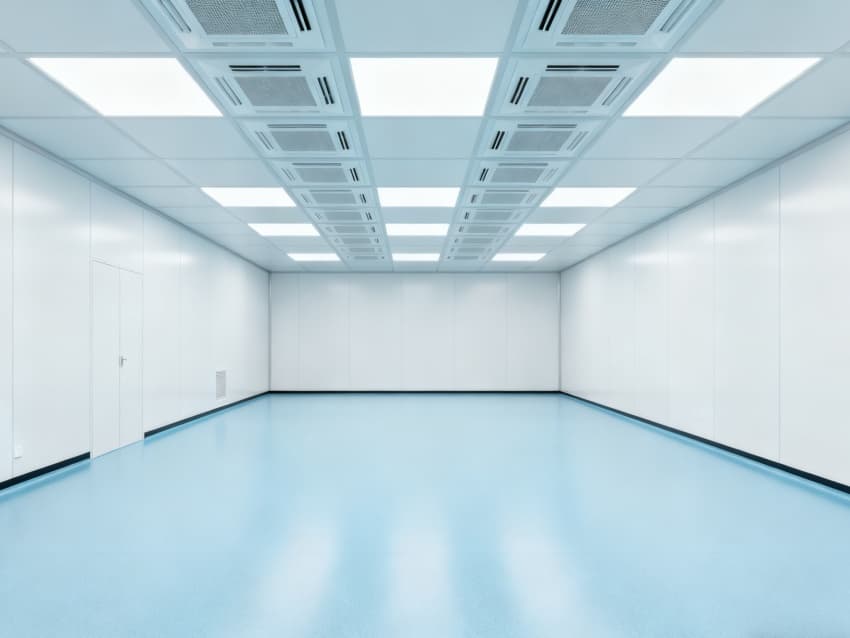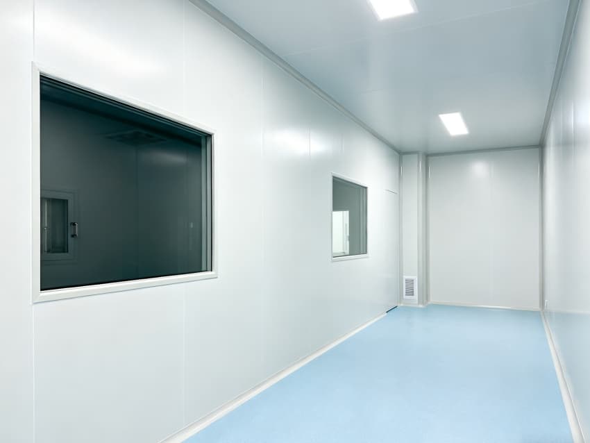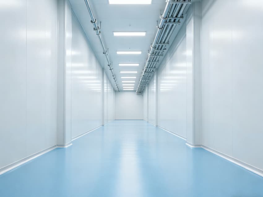 內(nèi)部按功能劃分為六大潔凈區(qū)域:核心潔凈生產(chǎn)區(qū)(淺藍(lán)色防滑防霉地面)預(yù)留開闊空間,滿足發(fā)酵罐、純化設(shè)備等后期安裝;頂部潔凈送風(fēng)區(qū)通過規(guī)整風(fēng)閥系統(tǒng),實現(xiàn)萬級潔凈度均勻送風(fēng);墻面過渡區(qū)采用圓弧轉(zhuǎn)角設(shè)計,避免粉塵堆積;密閉觀察區(qū)設(shè)雙層鋼化觀察窗,兼顧生產(chǎn)監(jiān)控與無菌隔離;縱向設(shè)備預(yù)留區(qū)保留8米凈高,適配大型凍干設(shè)備動線;輔助緩沖區(qū)銜接車間入口,搭配風(fēng)淋系統(tǒng),實現(xiàn)人員/物料潔凈過渡。整體空曠布局既保障潔凈操作空間,又滿足皖北生物制藥企業(yè)靈活擴產(chǎn)需求,為本地藥企提供合規(guī)、高效的生產(chǎn)載體。
