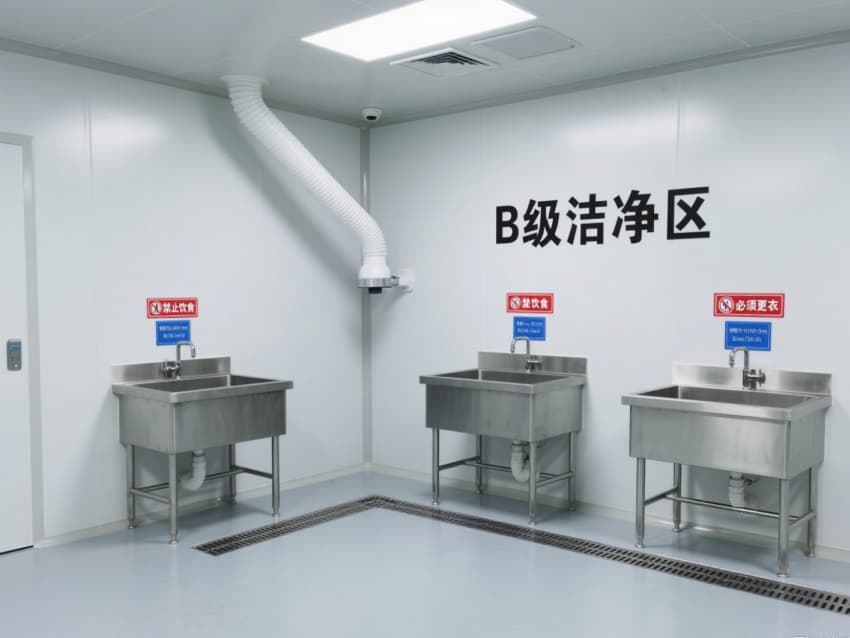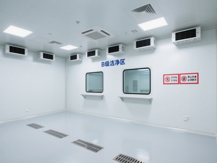 車間嚴(yán)格遵循萬級(jí)潔凈標(biāo)準(zhǔn),每立方米空氣中≥0.5μm微粒數(shù)≤35.2萬個(gè)、菌落數(shù)≤10個(gè)。白色抗菌彩鋼板搭建的墻體與吊頂,具備抗菌、耐腐蝕、易消毒特性,墻面與地面的圓弧過渡設(shè)計(jì)徹底消除衛(wèi)生死角;淺灰防靜電環(huán)氧地坪則通過防靜電處理,避免靜電干擾生物活性物質(zhì)。?