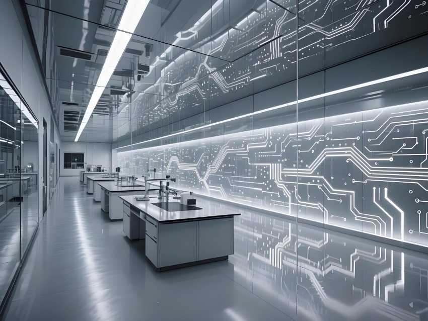 本實驗室采用"量子科技美學(xué)"設(shè)計,將納米尺度的精密感轉(zhuǎn)化為空間敘事。主實驗區(qū)以鏡面銀與深空灰為基調(diào),半透明防輻射玻璃墻體內(nèi)嵌電路板紋理光帶,象征微觀世界的電子軌跡。百級潔凈區(qū)的金色氣流箭頭與千級區(qū)的藍色光暈形成能級躍遷般的視覺分級,CVD設(shè)備艙的蜂窩狀散熱孔與懸浮式控制面板構(gòu)成未來工廠意象。地面導(dǎo)光纖維模擬分子結(jié)構(gòu)網(wǎng)絡(luò),天花板動態(tài)粒子監(jiān)測屏以數(shù)據(jù)流形式投射納米顆粒分布。通過冷調(diào)LED與設(shè)備熒光的層次照明,在滿足EMI屏蔽與化學(xué)防護需求的同時,創(chuàng)造出如同操作量子領(lǐng)域的沉浸式科研環(huán)境,透明氣閘門上的全息警示標志進一步強化尖端材料研究的科技儀式感。
