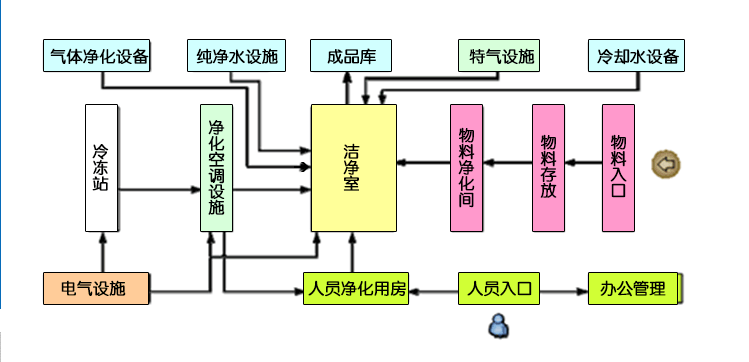 LED/液晶/線路板潔凈無塵室除了要完成上述的功能、目的外,因為制造過程中工藝生產(chǎn)設(shè)備都是在潔凈無塵室內(nèi)操作的,以供生產(chǎn)工藝機(jī)臺使用,潔凈無塵室與各系統(tǒng)關(guān)系如下: