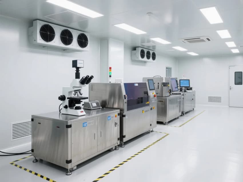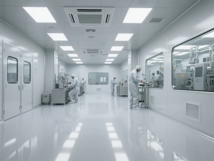 本方案采用"科技極簡主義"風(fēng)格,以ISO 5級(jí)(萬級(jí))潔凈標(biāo)準(zhǔn)為核心。空間設(shè)計(jì)強(qiáng)調(diào)線性流動(dòng)感,灰白主色調(diào)搭配防靜電環(huán)氧樹脂地坪,墻面采用抗菌彩鋼板。頂棚網(wǎng)格化FFU送風(fēng)單元配合側(cè)墻回風(fēng),形成垂直層流。功能分區(qū)明確,包含更衣緩沖間(Class 7)、核心生產(chǎn)區(qū)(Class 5)、設(shè)備維護(hù)通道。智能控制系統(tǒng)集成溫濕度(22±1℃/45±5%)、壓差(+10Pa)、粒子監(jiān)測顯示。創(chuàng)新采用LED黃光照明減少光致氧化,設(shè)備基座增設(shè)主動(dòng)減震系統(tǒng)。設(shè)計(jì)融合人機(jī)工程學(xué),防靜電設(shè)施覆蓋率100%,通過藍(lán)色光帶引導(dǎo)潔凈動(dòng)線,實(shí)現(xiàn)功能性與未來感的完美平衡。