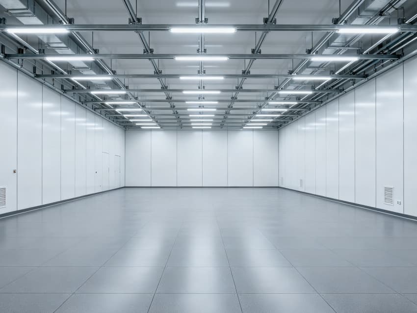 內(nèi)部按功能劃分為六大核心區(qū)域:潔凈生產(chǎn)區(qū)采用無設(shè)備空曠布局,預(yù)留8-12米柱距滿足光刻機(jī)、刻蝕機(jī)等大型設(shè)備安裝需求;管線集成區(qū)通過規(guī)整的頂部管線橋架系統(tǒng),實(shí)現(xiàn)水、電、氣、真空系統(tǒng)集中管控,減少管線交叉干擾;潔凈緩沖區(qū)設(shè)置于生產(chǎn)區(qū)入口,搭配墻面通風(fēng)口保障潔凈度過渡;設(shè)備預(yù)留區(qū)保留開闊橫向空間,支持后期工藝動線調(diào)整;結(jié)構(gòu)輔助區(qū)通過角落加固設(shè)計,滿足重型設(shè)備承重需求;墻面潔凈區(qū)采用光滑防污材質(zhì),降低粉塵附著率。整體空間兼顧半導(dǎo)體生產(chǎn)的潔凈標(biāo)準(zhǔn)與功能靈活性,適配合肥半導(dǎo)體產(chǎn)業(yè)發(fā)展需求。