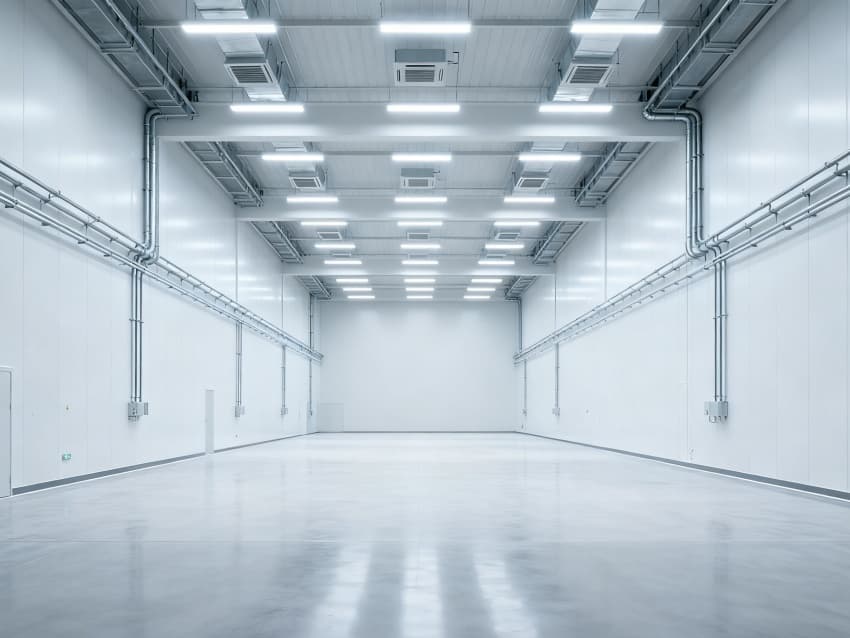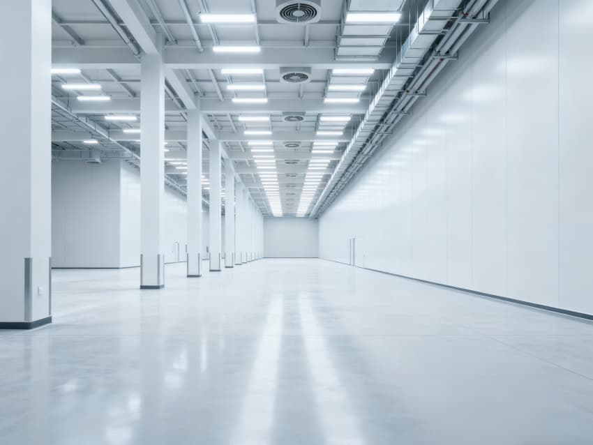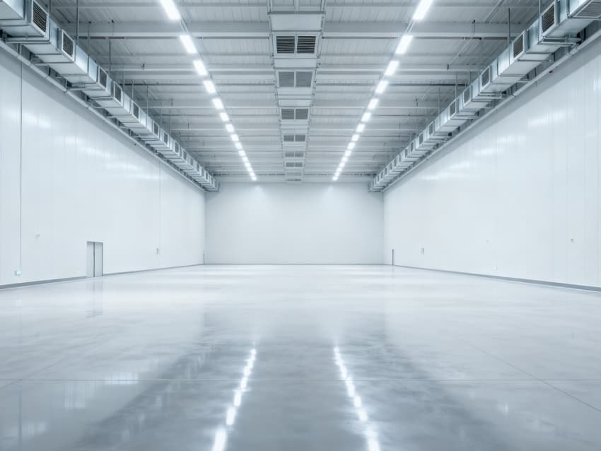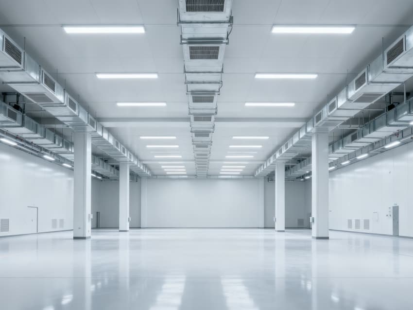 內部6個生產(chǎn)車間均為無設備空曠布局,按工業(yè)級潔凈與承重標準建設:地面鋪設耐磨防靜電環(huán)氧地坪,墻面采用白色環(huán)保潔凈墻板,陰陽角做圓弧處理減少積塵;柱網(wǎng)間距達10米,預留設備安裝與物流通道空間;頂部整合恒溫恒濕新風系統(tǒng)與節(jié)能LED照明,管線暗藏于吊頂內,避免空間雜亂;車間之間通過通透玻璃隔斷銜接,進一步強化整體空曠感,為新能源產(chǎn)品規(guī)模化生產(chǎn)、柔性產(chǎn)線調整提供高效、潔凈的空間支撐。