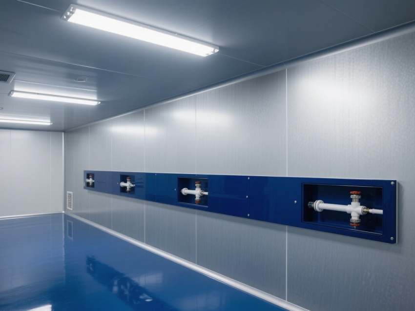 車間內(nèi)部整體呈銀灰色和藍色,給人一種現(xiàn)代感和科技感。墻面、地面和天花板均采用無縫設計,便于清潔和消毒,防止灰塵和微粒的積聚。照明系統(tǒng)明亮且均勻,提供了良好的工作環(huán)境。