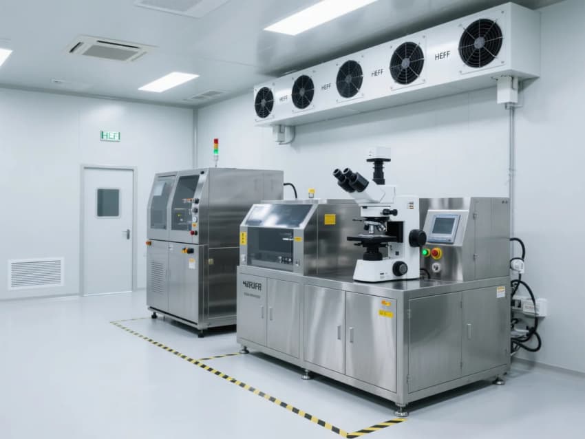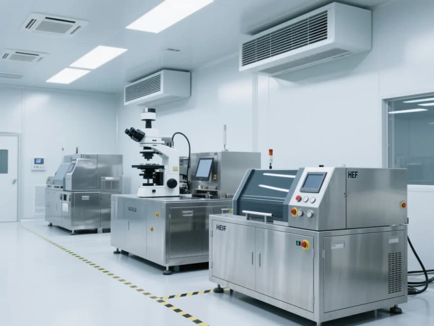 天花采用模塊化FFU(風(fēng)機(jī)過(guò)濾單元)系統(tǒng),配合高效HEPA過(guò)濾器,維持穩(wěn)定的氣流組織與潔凈度。設(shè)備區(qū)采用淺灰色不銹鋼圍擋,與白色潔凈墻面形成視覺(jué)區(qū)分,同時(shí)便于日常清潔維護(hù)。嵌入式LED無(wú)影燈帶提供均勻照明,減少作業(yè)陰影。整體設(shè)計(jì)強(qiáng)調(diào)功能性、安全性與可持續(xù)性,滿(mǎn)足電子光學(xué)制造的高標(biāo)準(zhǔn)環(huán)境需求。