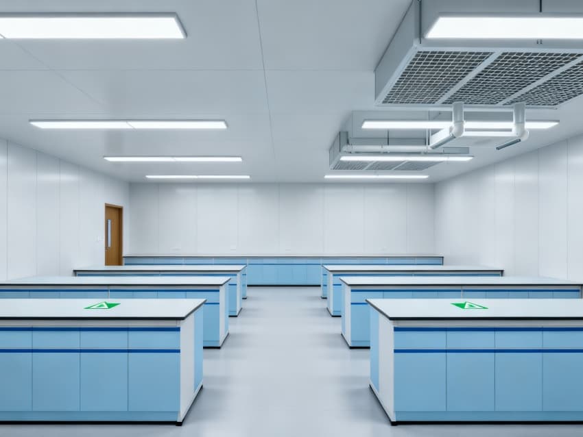 在核心操作區(qū)域,我們執(zhí)行的是高標(biāo)準(zhǔn)的潔凈要求,每立方米空氣里直徑0.5微米以上的灰塵、顆粒等雜質(zhì)不能超過352000個,相當(dāng)于達(dá)到了萬級潔凈標(biāo)準(zhǔn)(國際ISO8級)。而像走廊、儲物間這些輔助區(qū)域,要求會稍微低一些,執(zhí)行的是十萬級潔凈標(biāo)準(zhǔn)(國際ISO9級)。采用初效-中效-高效三級空氣過濾系統(tǒng),配合側(cè)送頂回氣流設(shè)計,實現(xiàn)每小時18-22次空氣置換;墻面選用耐酸堿潔凈彩鋼板,地面為防滑PVC無菌卷材,所有邊角做圓弧密封處理,減少清潔死角。室內(nèi)溫度穩(wěn)定在22±2℃,相對濕度控制在45%-55%,關(guān)鍵實驗區(qū)維持微正壓,有效隔絕外界污染與交叉感染,既符合高校生物實驗教學(xué)規(guī)范,也為科研數(shù)據(jù)準(zhǔn)確性提供可靠環(huán)境保障。